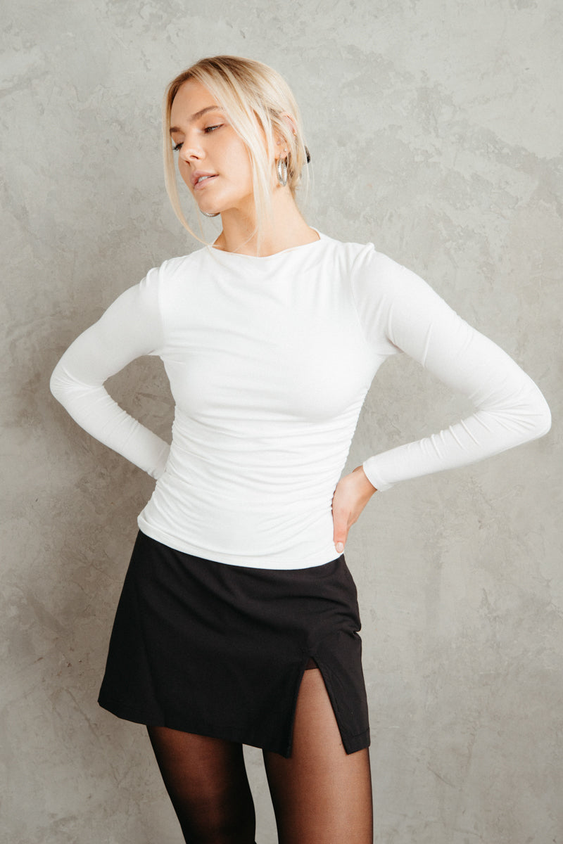 The Ashley Ruched Long Sleeve Top is the perfect elevated basic! This top features a boat neckline, long sleeves, side ruching, and a form fitting silhouette. Available in black and white. Pair with some to complete the look!