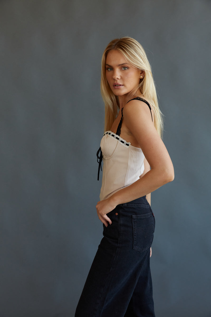 The Ayla Contrast Corset Top is the perfect combination of sultry and sweet! This feminine top features a bustier-style bodice, supportive boning details, black lace spaghetti straps, and a white lace trim with an interweaved black velvet ribbon that ties at the center.