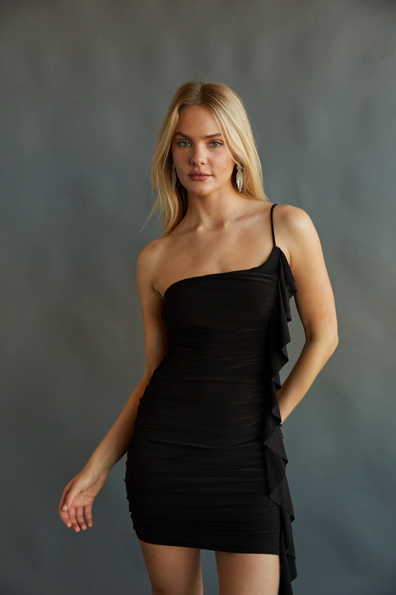 Get ready to stun in the Breanne One Shoulder Ruffle Bodycon Mini Dress! This bodycon mini dress features ultra flattering, all over ruching, and an asymmetrical, one shoulder neckline. Slip into a pair of to complete this gorgeous look!