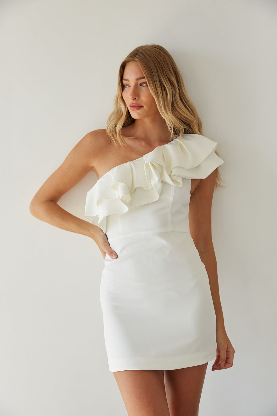 Make a statement in the Edith One Shoulder Ruffle Mini Dress. Perfect for graduation and sorority rush, this one shoulder mini dress features an eye catching tiered ruffle sleeve, bodycon silhouette, and mini length! Pair this mini dress with a chic pair of to complete the look!