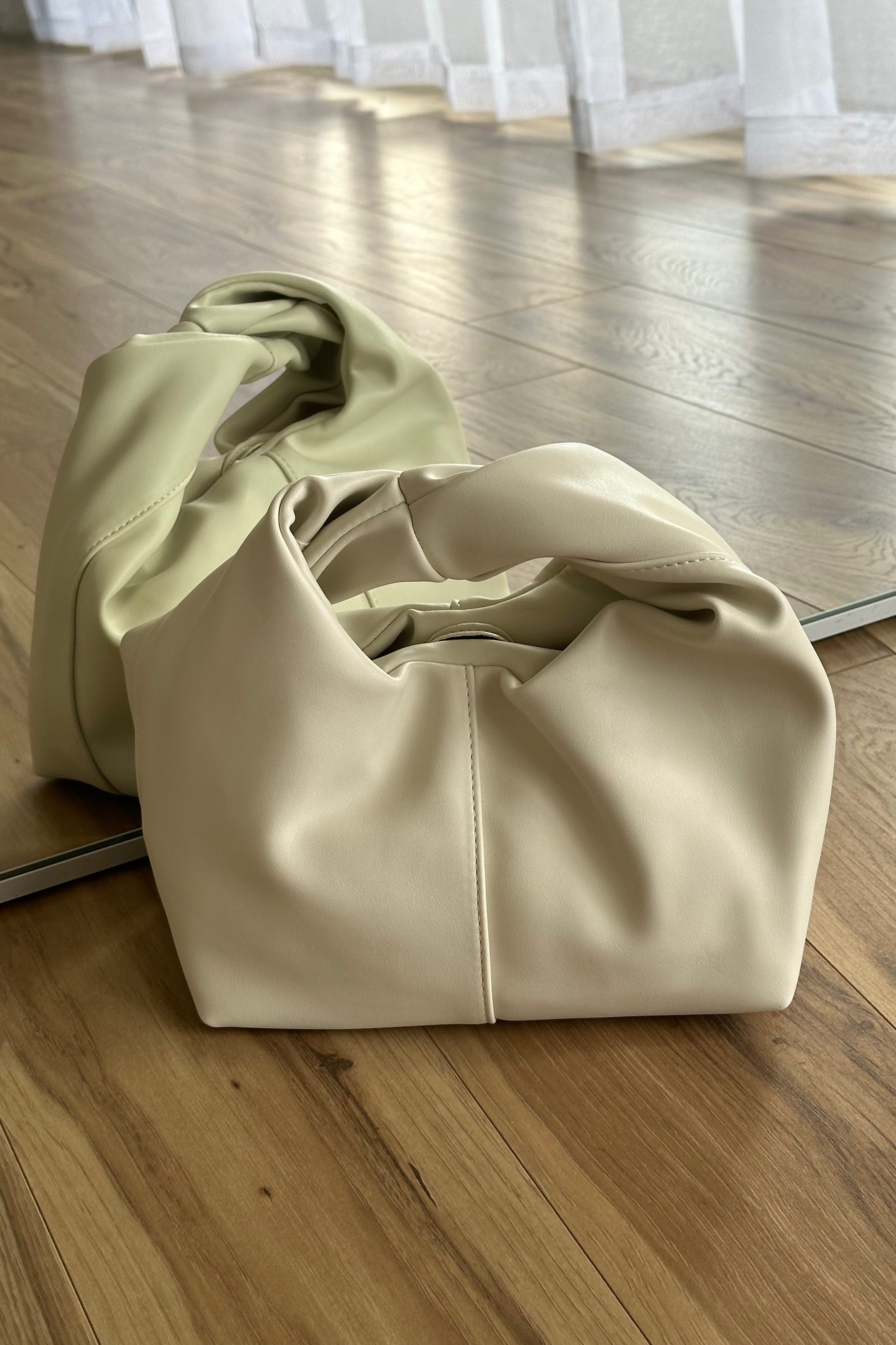 Introducing the Misty Handle Bag: a soft, semi-structured rectangular bag with a wide base, featuring two inner compartments, including a zip pouch. The top opening has a magnetic clasp closure, and the bag is highlighted by a statement wrap handle. Finished with a cotton inner lining, it combines practicality and style! Available in Bone; style with a new !