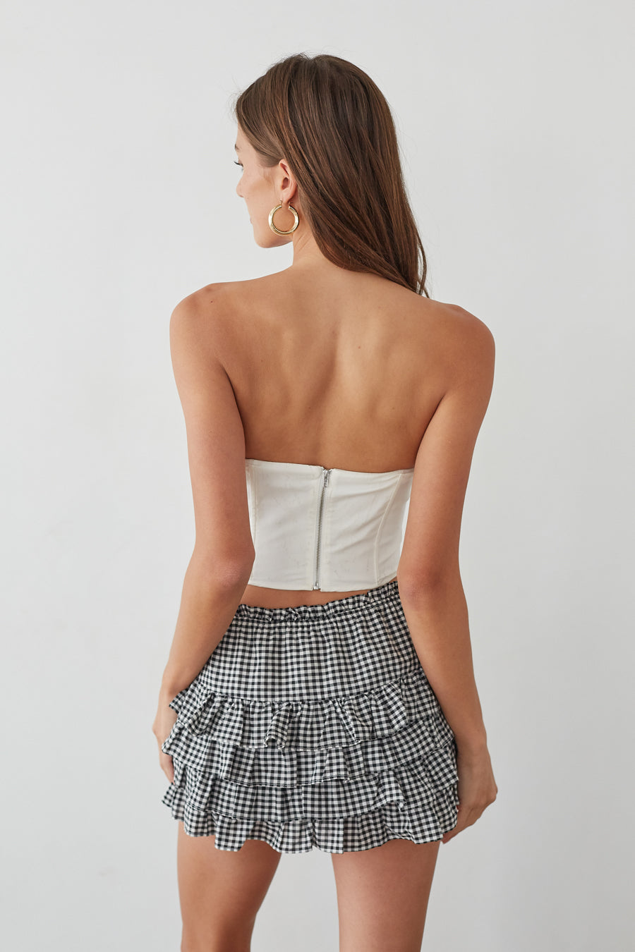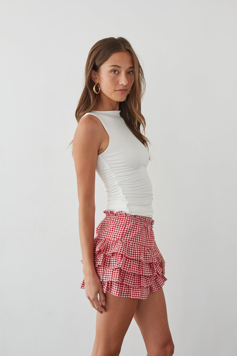 So darling in the Pearl Ruffle Gingham Skort! this unique features a quirky gingham pattern, flattering drop waist, and flirty tiered ruffles. Available in Red Gingham and Black Gingham; style with a to complete the look!