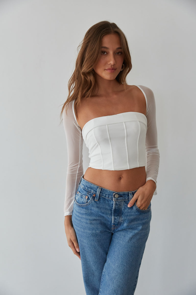 So trendy in the Rio Corset Shrug Set! This corset top is complete with a strapless fold over neckline, a lace up back with silver grommets, and a mesh long sleeve shrug. Available in black and white. Pair with your favorite to complete the look!