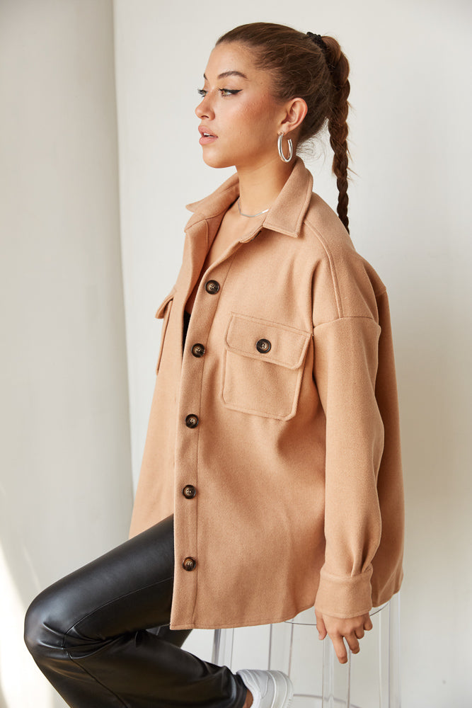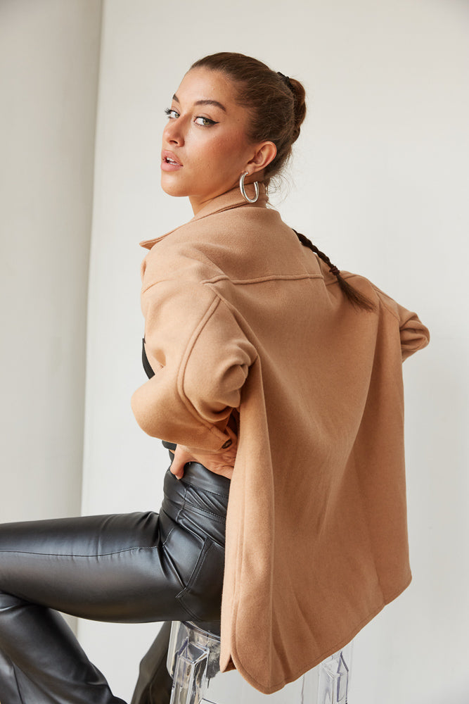 Hey babe, meet your perfect fall staple: The Scout Button Up Shacket! This cozy shirt jacket us complete with a button down front, a fuzzy wool-like fabric, two button front pockets, and a relaxed boxy fit. Available in brown. Pair with the for the ultimate trendy look.